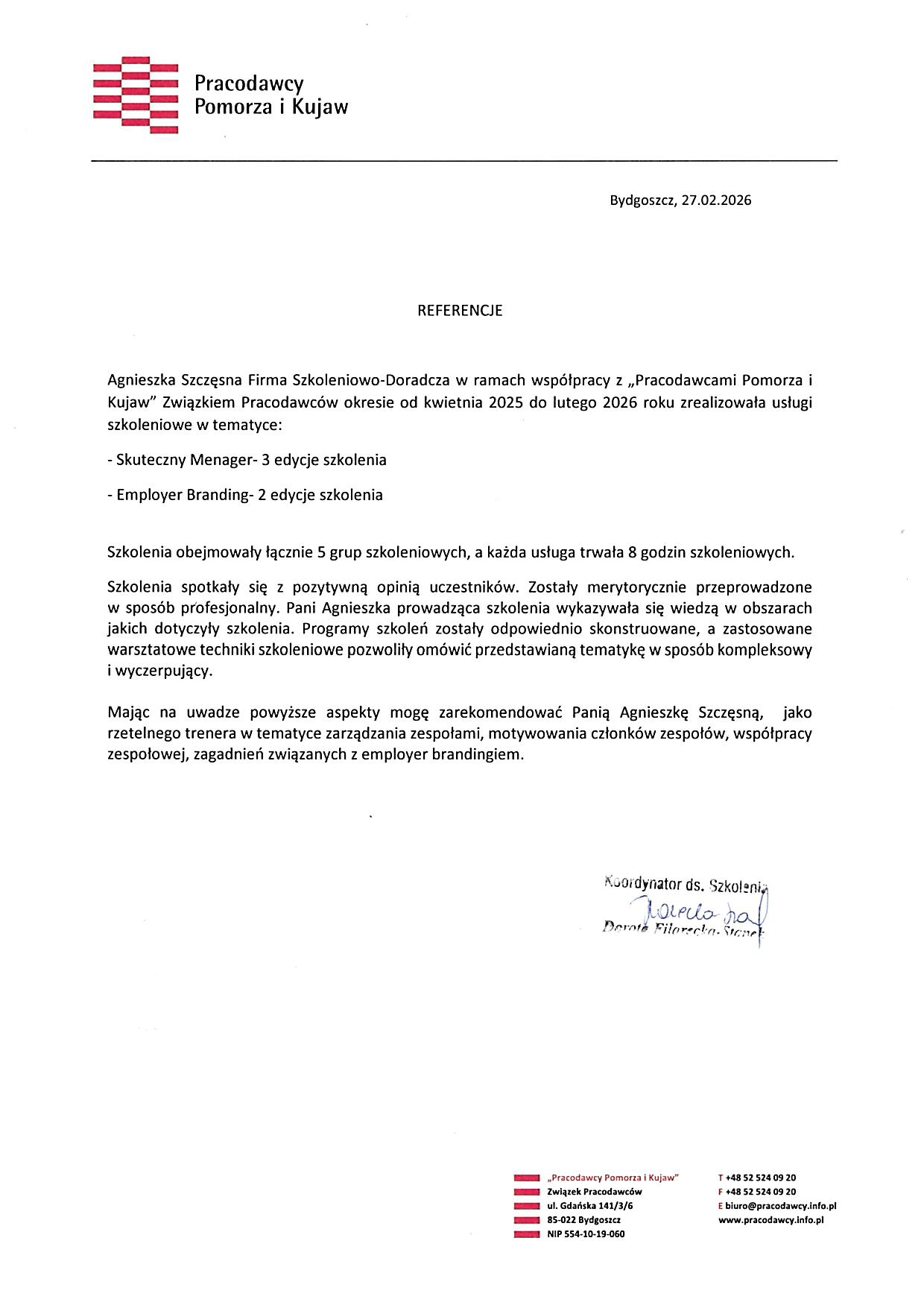 Szkolenie prowadzone przez Panią Agnieszkę Szczęsna zostało zrealizowane w sposób profesjonalny, rzetelny i zgodny z założeniami projektowymi.