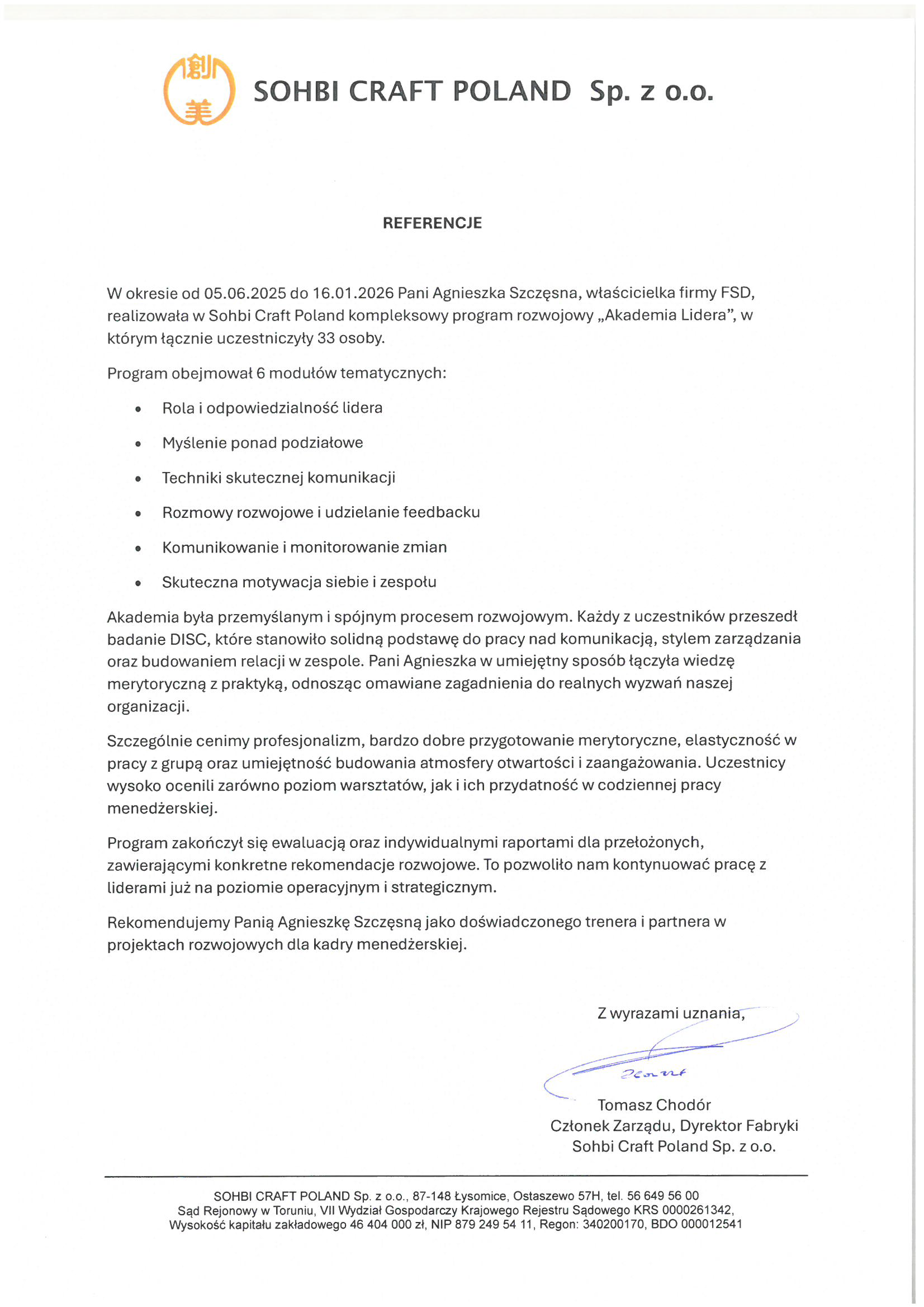 i umiejętność pracy z liderami w środowisku przemysłowym zasługują na najwyższe uznanie. Rekomendujemy współpracę z Panią Agnieszką Szczęsna jako solidnym i kompetentnym partnerem szkoleniowym